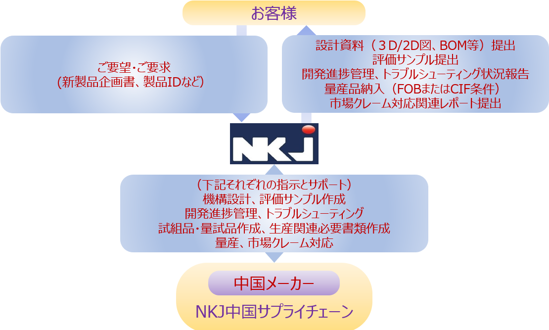 NKJは、品質面などで安心できる製造能力を持った中国サプライチェーンとのOne Teamで、新規の開発案件を立ち上げます。